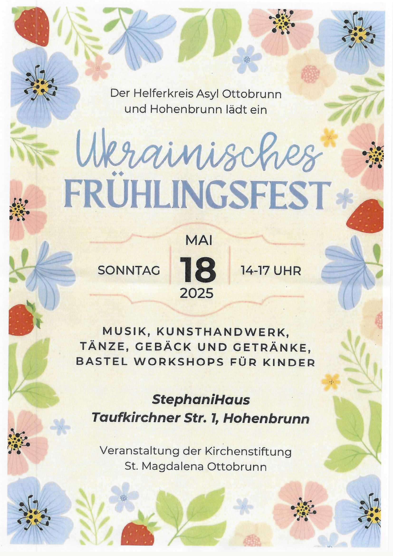 Über 25 Frauen aus Hohenbrunn und den umliegenden Gemeinden beginnen nach Ostern gemeinsam mit ihren Kindern mit den Festvorbereitungen. Der Frauenchor "Tschar Zillya" wird alte rituelle Lieder, die zum Beginn des Frühlings gesungen werden, unter dem Titel "Vesnyanky" und in ukrainischen Trachten präsentieren. Der laute Ruf "Hu" am Ende jeder Strophe soll den Frühling anlocken. Kinder und Jugendliche treten in ihren Chören "Mandryky" (Kekse) und "Weselka" (Regenbogen) auf und zeigen ihr Talent in einem Gitarrenduett. Für die kleinen Besucher werden Bastelworkshops angeboten, in denen sie traditionellen Perlenschmuck, der Malerei "Petrykiwka" und Stoffpuppen "Motanka", eine Art Schutzengel, herstellen können. Zauberstäbe und Armbänder werden auch die Kleinsten begeistern. Tanzbegeisterte haben die Möglichkeit, in einem Workshop ukrainische Volkstänze zu lernen. Viele der Flüchtlinge haben inzwischen Deutsch gelernt und freuen sich auf Begegnungen und Gespräche. Für das leibliche Wohl ist mit Getränken und Gebäck bestens gesorgt.
