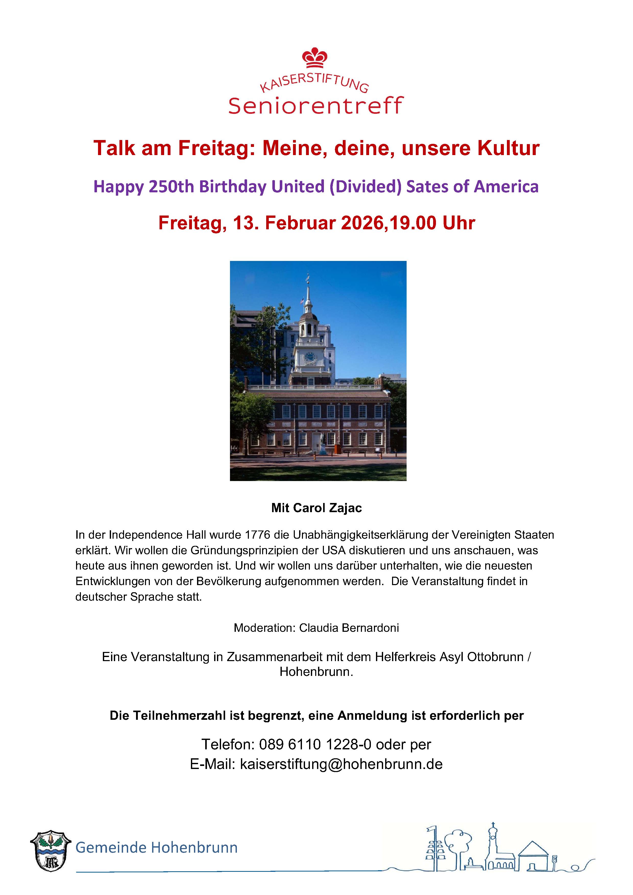 Am Samstagnachmittag trifft sich das Koch-Team um 16 Uhr mit den angemeldeten Hobbyköchinnen und -köchen; bis zu zehn Personen können gemeinsam kochen. Nach einer Kennenlern-Runde werden die oft besonderen Zutaten und die geplanten Rezepte vorgestellt. Dann wird geschält, geschnipselt, gewogen, gerührt, gekocht, gebacken … gelacht, gestikuliert, gedolmetscht und erzählt, vom Geschmack der Heimat, von den Düften der Kindheit. An Herd und Backofen wird es warm, intensive Gerüche ziehen durch den Raum. Die Veranstalterin erinnert: „In einer halben Stunde kommen die Gäste …“ Am schwarzen Brett stehen die Gerichte angeschrieben, die Tische werden liebevoll gedeckt. Um 19 Uhr kommen weitere Gäste zum Essen dazu. Das Koch-Team stellt den Gästen an der großen Theke die Speisen vor. In bunt gemischten kleinen Tischgruppen werden die Gerichte genossen. Essen und die Zubereitung sind ein guter Einstieg ins Gespräch. „In Gemeinschaft schmeckt es einfach besser“, so eine Teilnehmerin. Im Januar steht die chinesische Küche im Fokus. Die Termine erscheinen im Monatsprogramm der Kaiserstiftung; dort erfolgt auch die Anmeldung zum Kochen bzw. zum Essen. Möchten Sie ein Essen mit Gerichten Ihrer Heimat gemeinsam mit anderen Teilnehmenden aus verschiedenen Ländern – von Jugendlichen bis Senioren – kochen? Dann melden Sie sich bei uns, Dany Graser und Heidi Maurer, Mail: info@helferkreis-asyl.com oder direkt in der Kaiserstiftung. Helferkreis Asyl Ottobrunn/Hohenbrunn (Quelle: "Gemeindeblatt Hohenbrunn", Dezember 2025, Seite 52)
